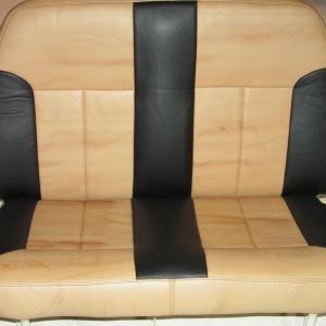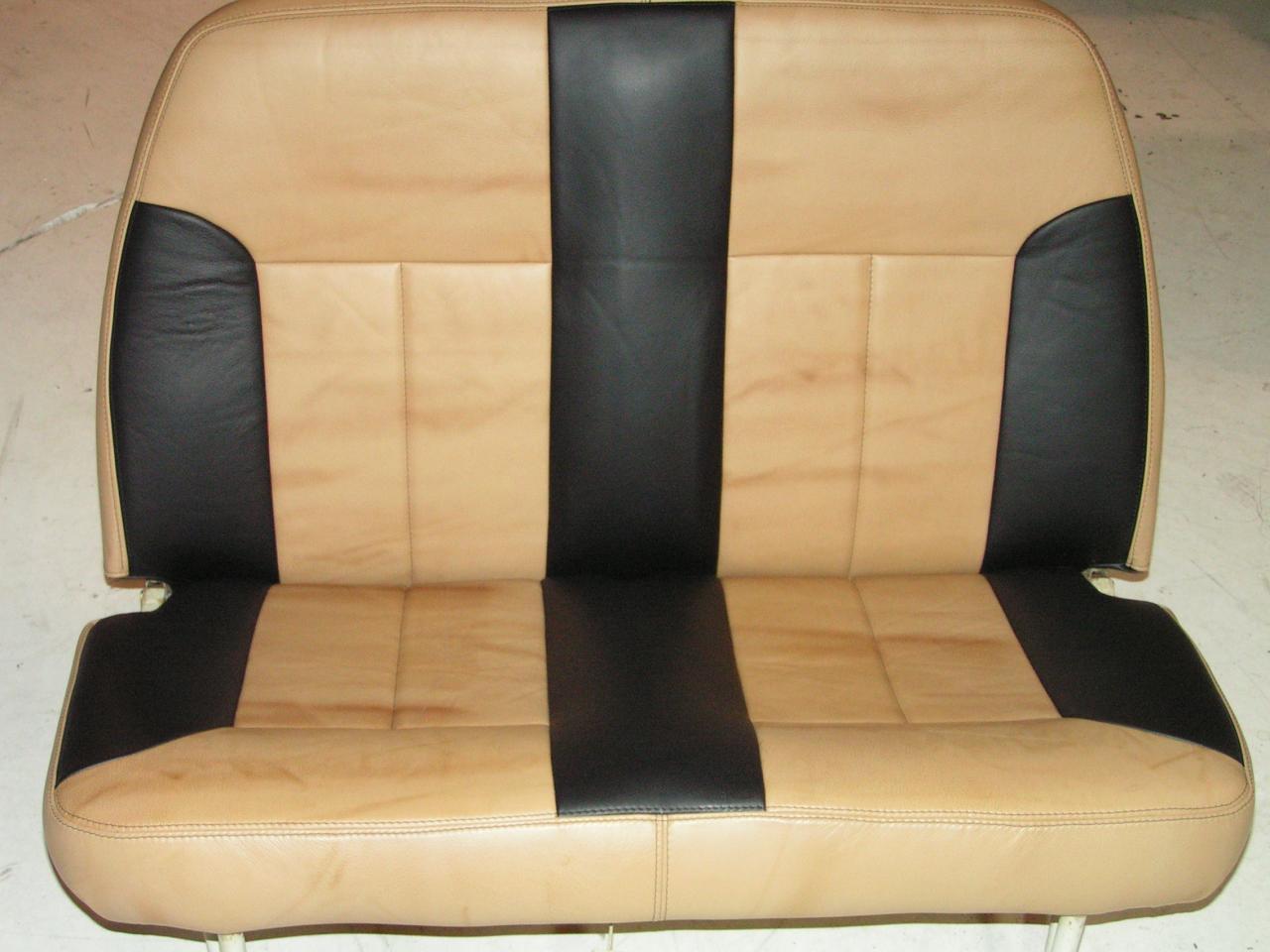 DOUBLE BACK BENCH SEAT IMPLEMENTED THE BLACK LEATHER ACCENT STRIPS TO COORDINATE WITH REMAINING INTERIOR.